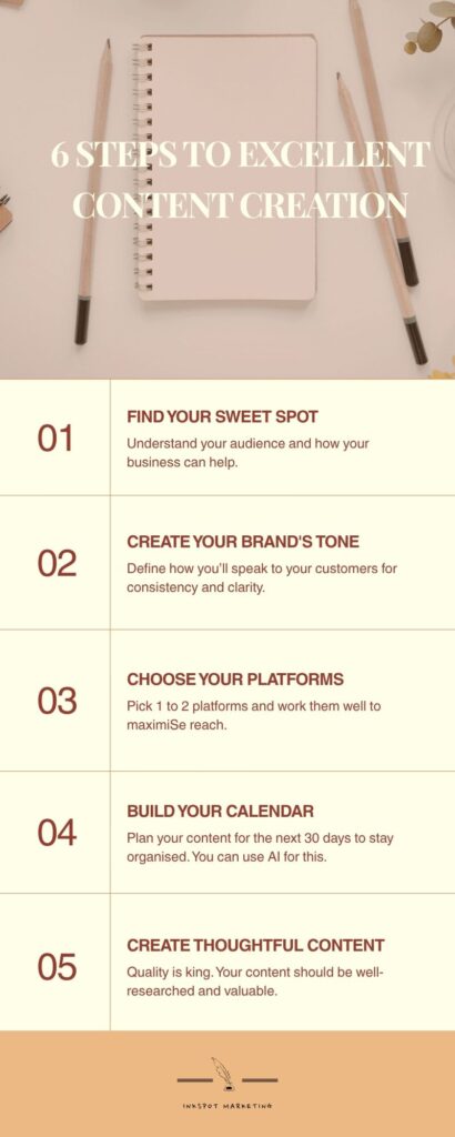 Start by talking to your audience to understand and find your “sweet spot” (what they need combined with what you offer). Develop your brand’s tone of voice, choose one to two platforms to focus on, create a content calendar, and produce thoughtful content that addresses pain points. Track what works and adjust your plan accordingly.