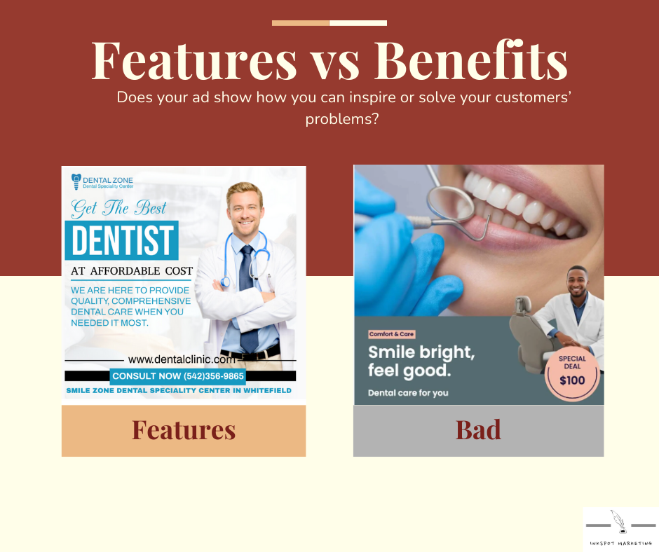 However, the ad on the right is customer solution-focused. The headline sells hope and confidence. This is the promise that would entice customers to visit your dental clinic on the right. Even the visual focuses on a customer with a good set of teeth, smiling. The ad promises smiles and the ability to feel good, a benefit that customers can relate to.